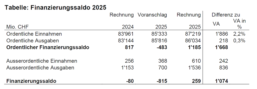 Vor allem dank temporär höheren Gewinnsteuereinnahmen aus dem Kanton Genf (1,5 Mrd.) hat der Bund 2025 einen Finanzierungsüberschuss von 0,3 Milliarden Franken erzielt. Budgetiert war ein Defizit von 0,8 Milliarden. Die ordentlichen Einnahmen fielen insgesamt um 1,9 Milliarden oder 2,2 Prozent höher aus als budgetiert (Abweichung im langjährigen Mittel: 0,3 %). Zugleich lagen die ordentlichen Ausgaben des Bundes 2025 erstmals seit der Einführung der Schuldenbremse im Jahr 2003 über dem Budgetwert. Dies ist unter anderem auf den Nachtragskredit für Horizon Europe (EU-Forschung) zurückzuführen.