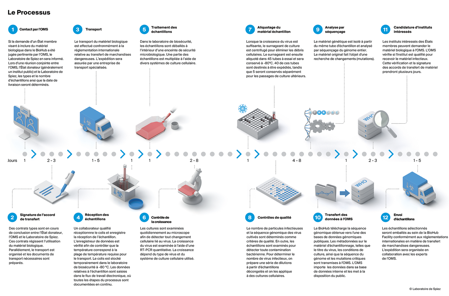 Depuis 2021, la Suisse met le Laboratoire de Spiez à la disposition pour des tâches relevant du système BioHub de l'OMS.